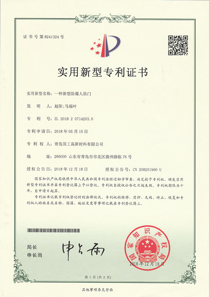 —種新型防爆人防門 - 榮譽資質 - 青島湛江鑫本航空航天集团****